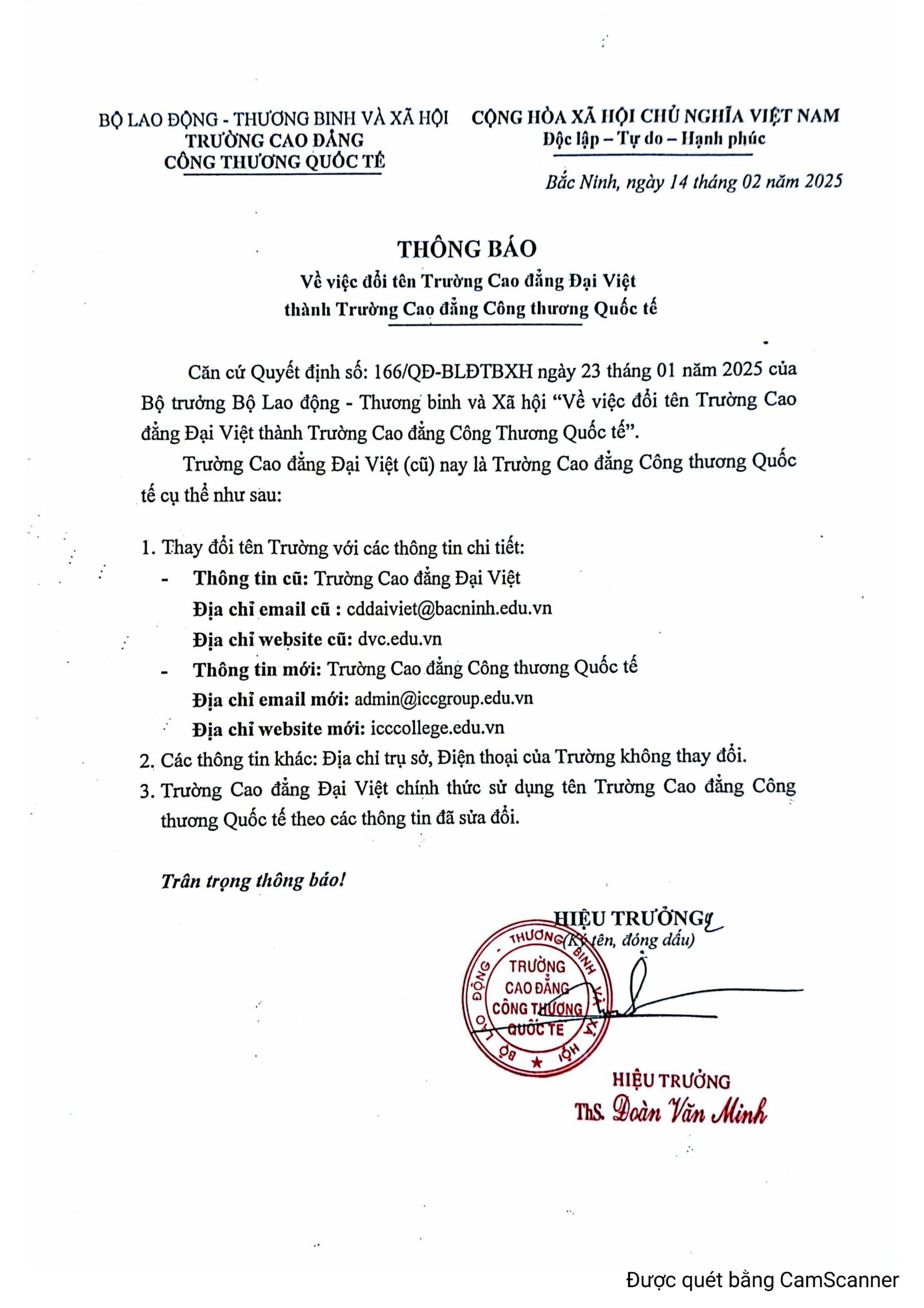 THÔNG BÁO VV: Đổi tên trường Cao đẳng Đại Việt thành Cao đẳng Công thương Quốc tế – ICC